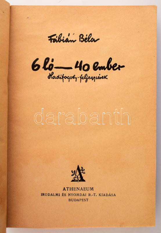Fábián Béla: 6 ló - 40 ember. Hadifogoly feljegyzések. Bp.,[1930.], At... https://www.darabanth.com/hu/500-Gyorsarveres/500.0/Konyvek/Konyvek-Militaria-Katonasag~2000065/Fabian-Bela-6-lo-40-ember-Hadifogoly-feljegyzesek-Bp-1930-Athenaeum-332-p-Egyetlen-~II3409378