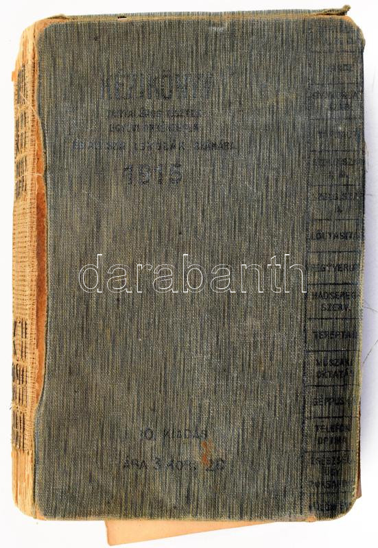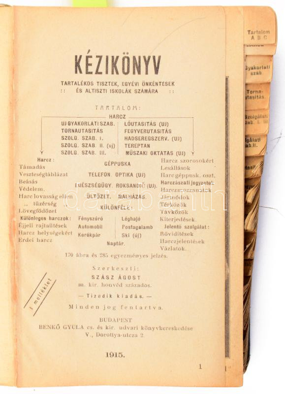 Leírás: Szász Ágost: Kézikönyv honvéd altisztek, altiszti iskolák és egyévi önkéntesek számára. 170 ábra és 285 egyezményes jelzés. Bp., 1915. Tizedik kiadás, 444p. Regiszteres. Kiadói, kopott egészvászon kötésben, hiányzó gerinccel