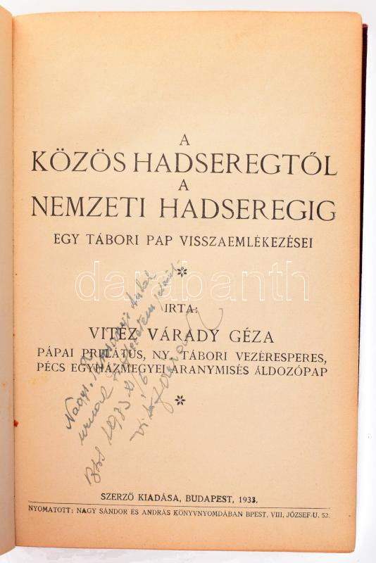 Várady Géza: A közös hadseregtől a nemzeti hadseregig. Egy tábori pap visszaemlékezései. DEDIKÁLT példány