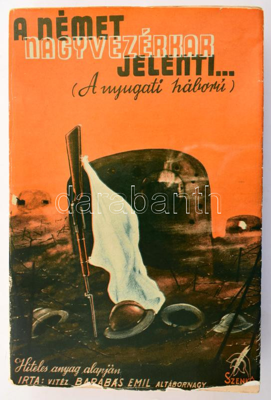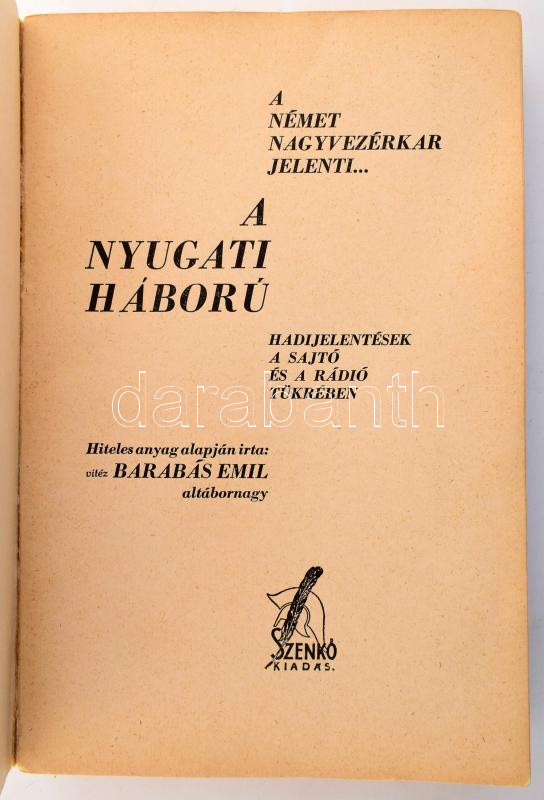 vitéz Barabás Emil: A német nagyvezérkar jelenti... (A nyugati háború.) Hadijelentések a sajtó és a rádió tükrében. Hiteles anyag alapján írta - -. Bp.,(1940), Szenkó, (Centrum-ny.), 289+3 p. A mű szerepel az Ideiglenes Nemzeti Kormány által 1945-ben kiadott, tiltott könyvek listáján. Kiadói illusztrált papírkötésben, kissé kopott borítóval. színes sorkiemelésekkel.