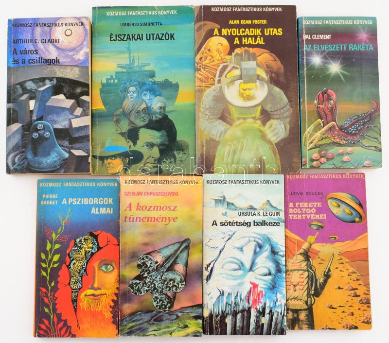 8 db Kozmosz fantasztikus könyv - A sötétség balkeze; A város és a csillagok; A fekete bolygó testvérei; A psziborgok álmai; A kozmosz tüneménye; Az elveszett rakéta; A nyolcadik utas a halál; Éjszakai utazók. Kiadói papírkötés, jó állapotban.