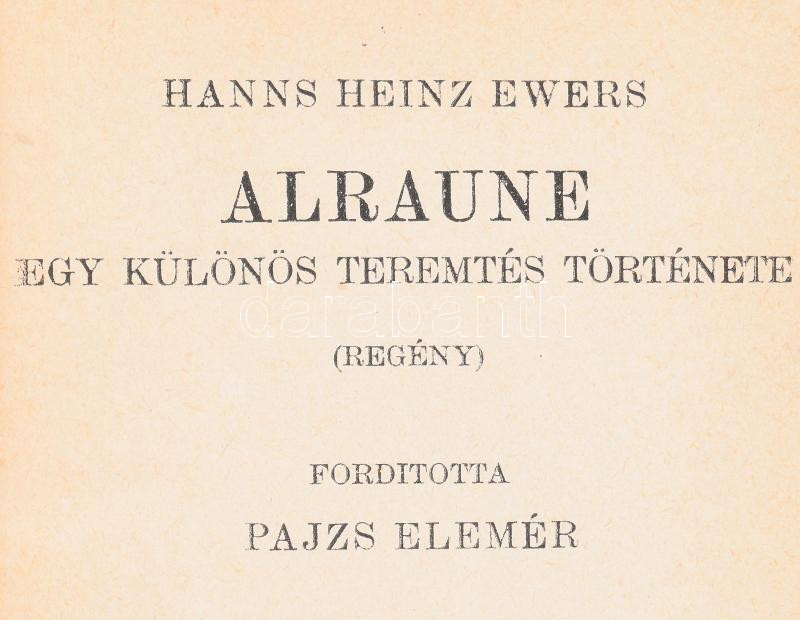 Hans Heinz Ewers: Alraune. Egy különös teremtés története. (Regény.) Ford.: Pajzs Elemér. Békéscsaba, 1917, Tevan, 378+6 p.Átkötött félvászon-kötés, kopott borítóval.