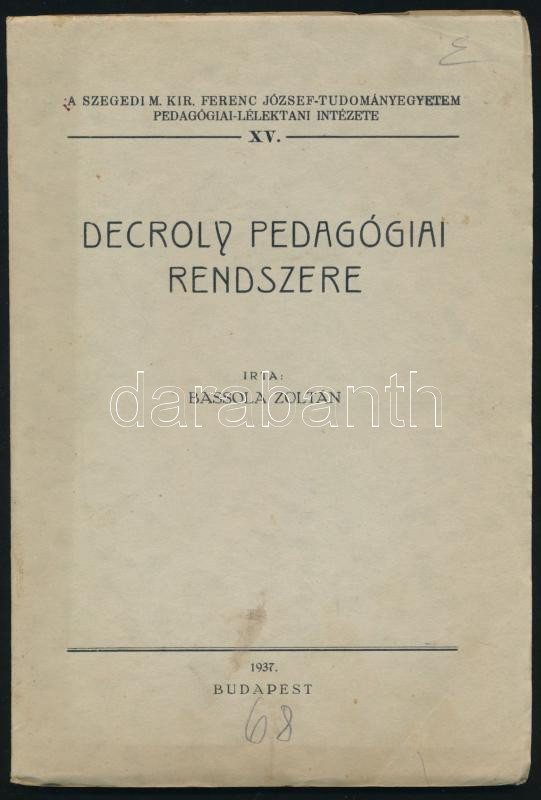 Bassola Zoltán: Decroly pedagógiai rendszere. A Szegedi M. Kir. Ferenc József-Tudományegyetem Pedagógiai-Lélektani Intézete XV. Bp., 1937, szerzői kiadás (Sárospatak, Fischer Lajos-ny.), 67+(1) p. Kiadói papírkötés, kissé sérült, koszos borítóval, néhány koszos lappal.