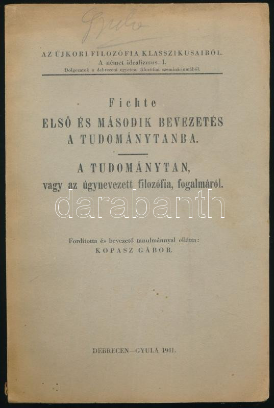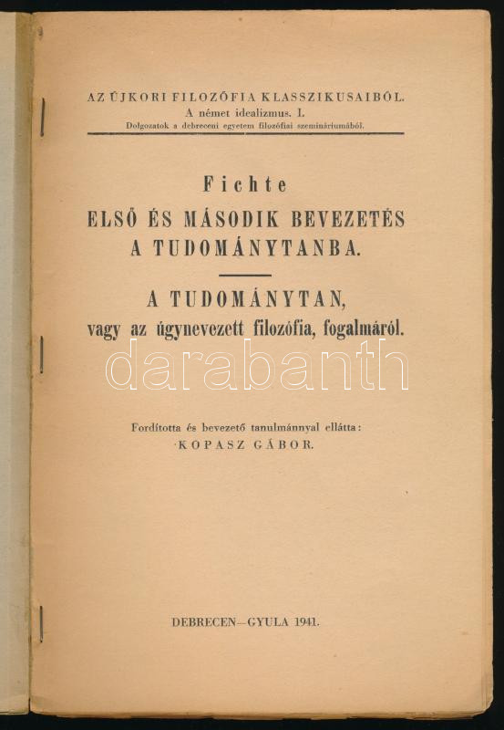 Fichte, [Johann Gottlieb]: Első és második bevezetés a tudománytanba. A tudománytan vagy az úgynevezett filozófia fogalmáról. Ford. és bevezető tanulmánnyal ellátta: Kopasz Gábor. Az újkori német filozófia klasszikusaiból. A német idealizmus I. Debrecen-Gyula, 1941, (Leopold Sándor-ny.), XXIX+(1)+120+(4) p. Kiadói papírkötés, kissé sérült borítóval és gerinccel, helyenként kissé sérült lapszélekkel, nagyrészt felvágatlan lapokkal.