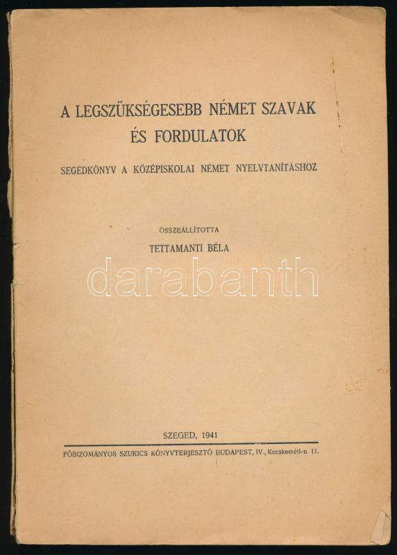 Tettamanti Béla: A legszükségesebb német szavak és fordulatok. Segédkönyv a középiskolai német nyelvtanításhoz. Összeáll.: - - . Szeged, 1941, szerzői kiadás (Városi-ny.), 223+(1) p. Kiadói papírkötés, sérült, az elülső borító különvált a könyvtesttől.