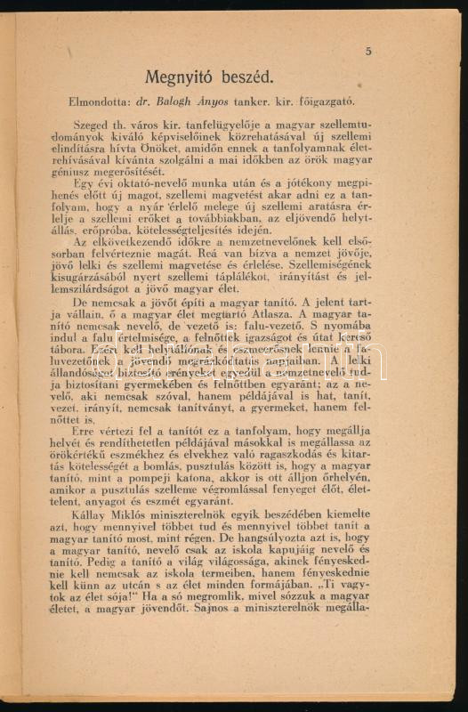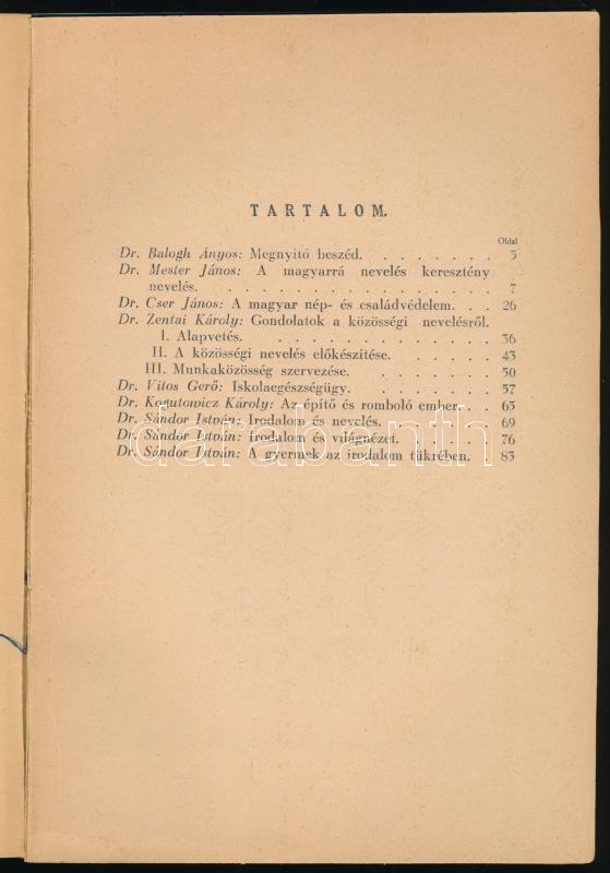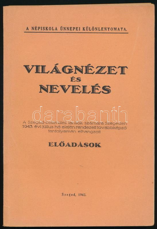 Világnézet és nevelés. A Szeged-belterületi tanítók számára Szegeden 1943. évi július hó elején rendezett továbbképző tanfolyamán elhangzott előadások. A Népiskola Ünnepei különlenyomata. Szeged, 1943, (Ablaka György-ny.), 91+(1) p. Kiadói papírkötés, részben szétváló fűzéssel, kijáró lapokkal. (Ritka!)