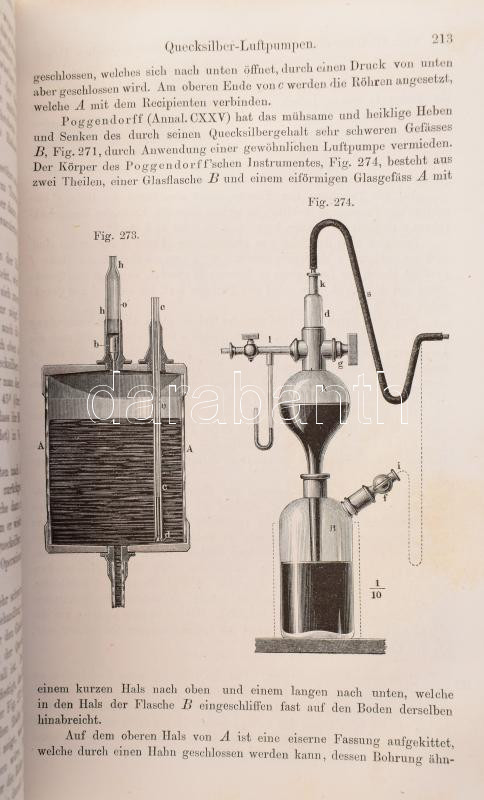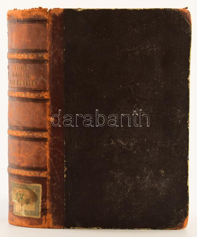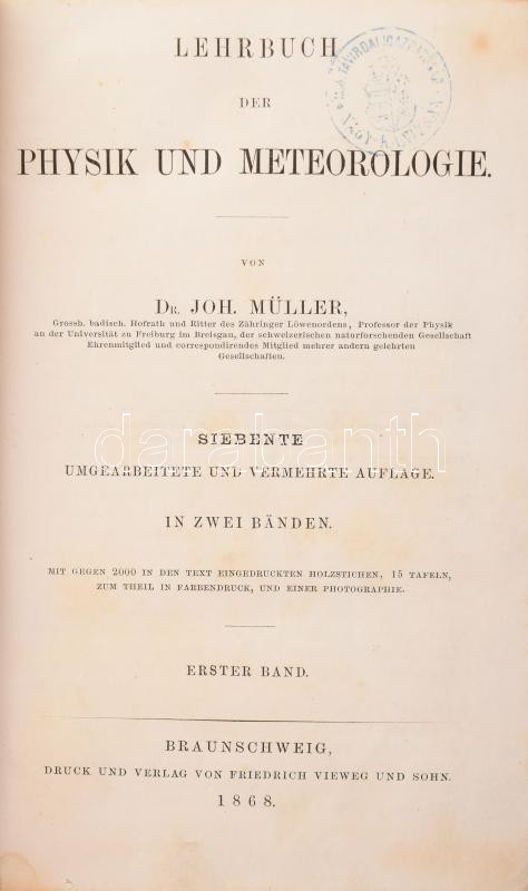 Dr. Joh[ann] Müller: Lehrbuch der Physik und Meteorolgie. Erster Band. Braunschweig, 1868., Friedrich Vieweg und Sohn, XXI+961 p.+III-XIV t. Siebente Umgearbeitete und Vermehrte Auflage. Német nyelven. Szövegközti fekete-fehér fametszetű képekkel illusztrált. Korabeli aranyozott gerincű félbőr-kötés, kopott borítóval, a gerincen kis sérüléssel és címkével, az elülső tábla belsejénél sérült kötéssel, két hiányzó táblával, a címlapon bélyegzéssel.