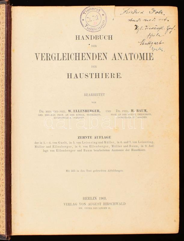 Handbuch der Vergleichenden Anatomie der Hausthiere. Bearbeitet von W. Ellenberger und H. Baum. Berlin, 1903, August Hirschwald, XVI+1004 p. Német nyelven. 10. kiadás. Kiadói aranyozott félbÅ‘r-kötés, kopott borÃtóval és gerinccel, a gerincen kis sérüléssel, jegyzetekkel és bejelölésekkel, a cÃmlapon kis hiánnyal.