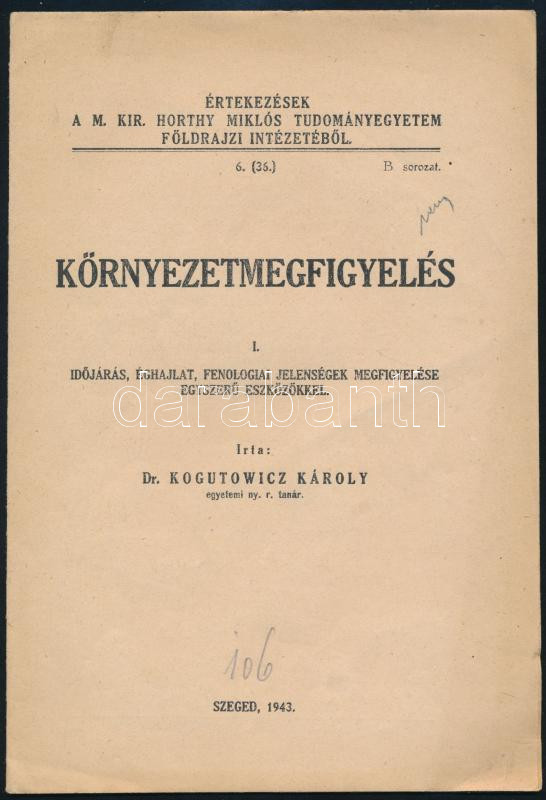 Kogutowicz Károly: Környezetmegfigyelés. I. Időjárás, éghajlat, fenologiai jelenségek megfigyelése egyszerű eszközökkel. Értekezések a M. Kir. Horthy Miklós Tudományegyetem Földrajzi Intézetéből 6. (36.) Szeged, 1943, (Ablaka György-ny.), 16 p. Kiadói tűzött papírkötés, kissé foltos. (Ritka!)