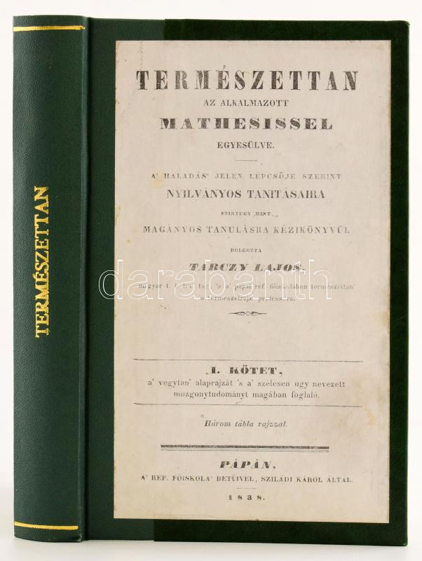 Tarczy Lajos: Természettan az alkalmazott mathesissel egyesülve I. köt.: A' vegytan alaprajzát 's a' szélesen ugy nevezett mozgonytudományt magában foglaló. Pápán, 1838., A Ref. Főiskola' betűivel, Sziládi Károl által, VIII+370+2 p. Első kiadás. Átkötött modern félvászon-kötés, körbevágott, foltos lapokkal, táblák nélkül.