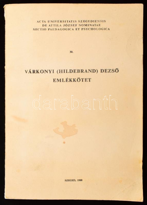 Leírás: Zakar András szerk.: Várkonyi (Hildebrand) Dezső emlékkötet. Szeged, 1988, JATE, foltos papírkötés. Megjelent 300 példányban.