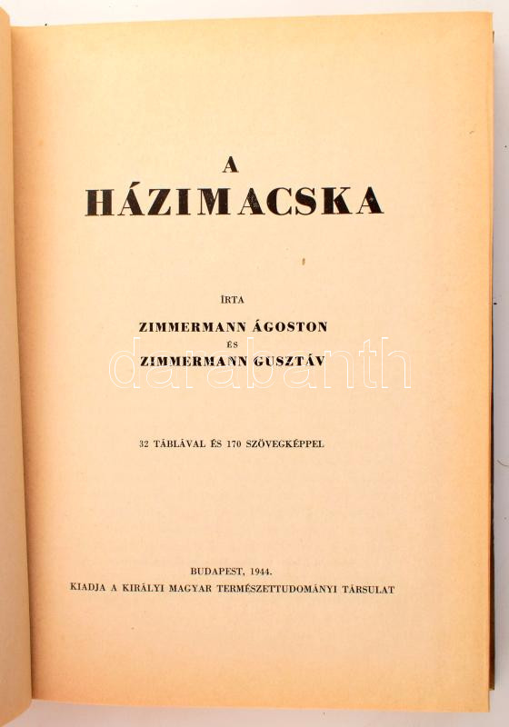 Zimmermann Ágoston - Zimmermann Gusztáv: A házimacska. Bp., 1944, Kir. M. Természettudományi Társulat, XVI+376 p.+ 32 t. Szövegközti és egészoldalas, fekete-fehér képekkel illusztrálva. Kiadói félvászon-kötés.