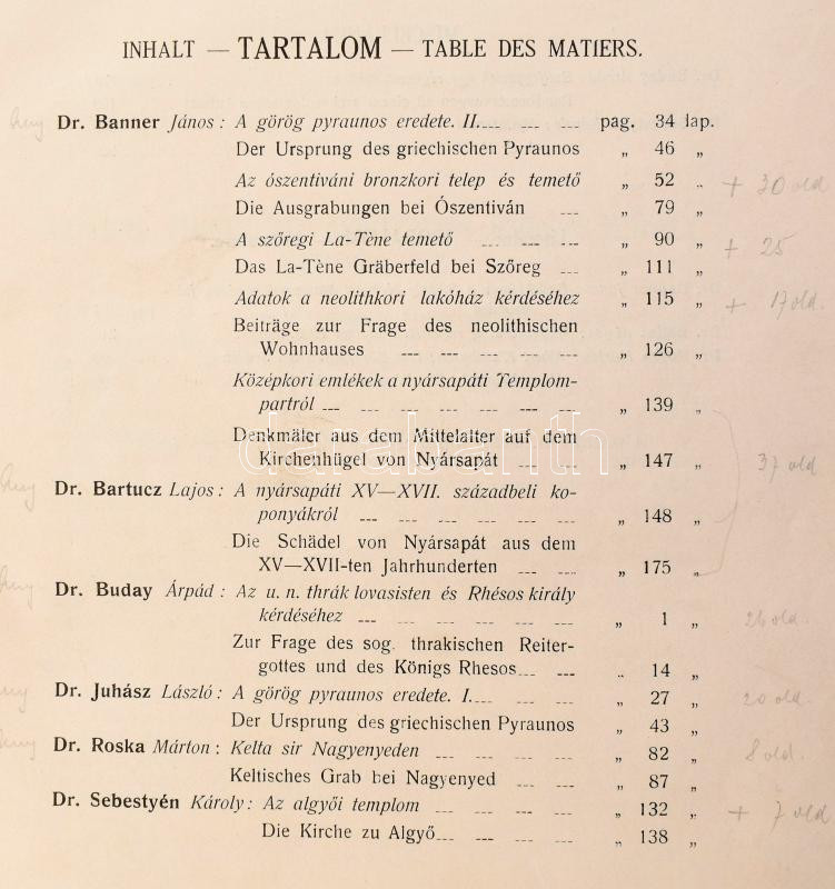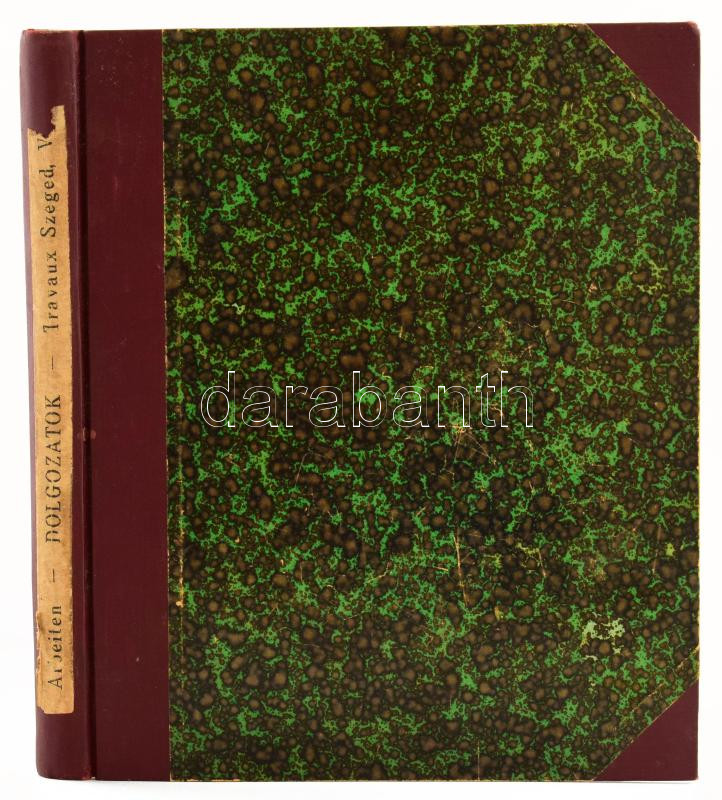 1929 Dolgozatok a m. kir. Ferencz József-tudományegyetem archeologiai intézetéből. V. évf. 1-2. sz. Szerk.: Buday Árpád. Szeged, 1929, Archeologiai Intézet (Városi-ny.), 2 sztl. lev.+ 222 p.+ 2 (kihajtható) t. Szövegközti és egészoldalas, fekete-fehér képekkel illusztrálva. Magyar és német nyelven. Átkötött félvászon-kötésben.