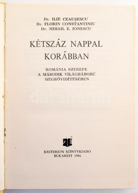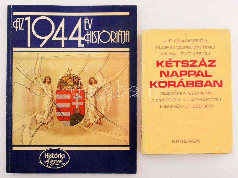 Leírás: 2 történelmi könyv: 1944 históriája. História könyvek; Ilie Ceasescu, Florin Constantiniu, Mihail E. Ionescu: Kétszáz nappal korábban. Bukarest, 1986. Kriterion. 244p. Kiadói egészvászon kötésben, papír védőborítóval.
