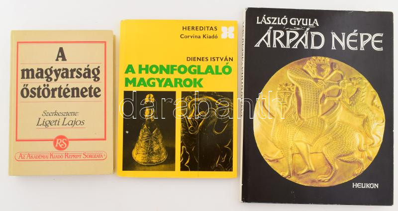Leírás: 3 db könyv: László Gyula: Árpád népe. Bp., 1988, Helikon. Első kiadás. Gazdag képanyaggal illusztrálva. Kiadói egészvászon-kötés, kiadói papír védőborítóban. + Dienes István: A honfoglaló magyarok. Bp., 1978, Corvina. Kiadói papírkötés. + Ligeti Lajos (szerk.): A magyarság őstörténete. Bp., 1986, Akadémiai Kiadó. Reprint kiadás. Kiadói egészvászon-kötés.