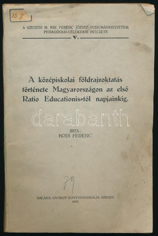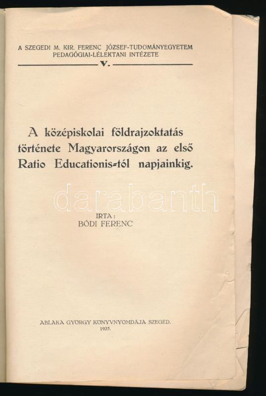 Bódi Ferenc: A középiskolai földrajzoktatás története Magyarországon az első Ratio Educationis-tól napjainkig. A Szegedi M. Kir. Ferenc József-Tudományegyetem Pedagógiai-Lélektani Intézete V. Szeged, 1935, Ablaka György-ny., 153+(3) p. Kiadói papírkötés, kissé viseltes, koszos borítóval, néhány szamárfüles lappal.