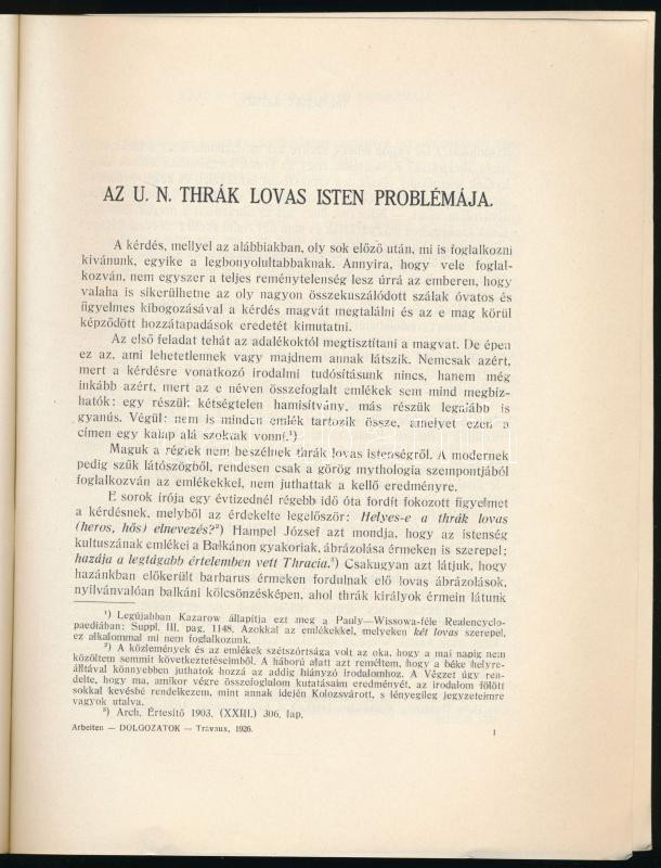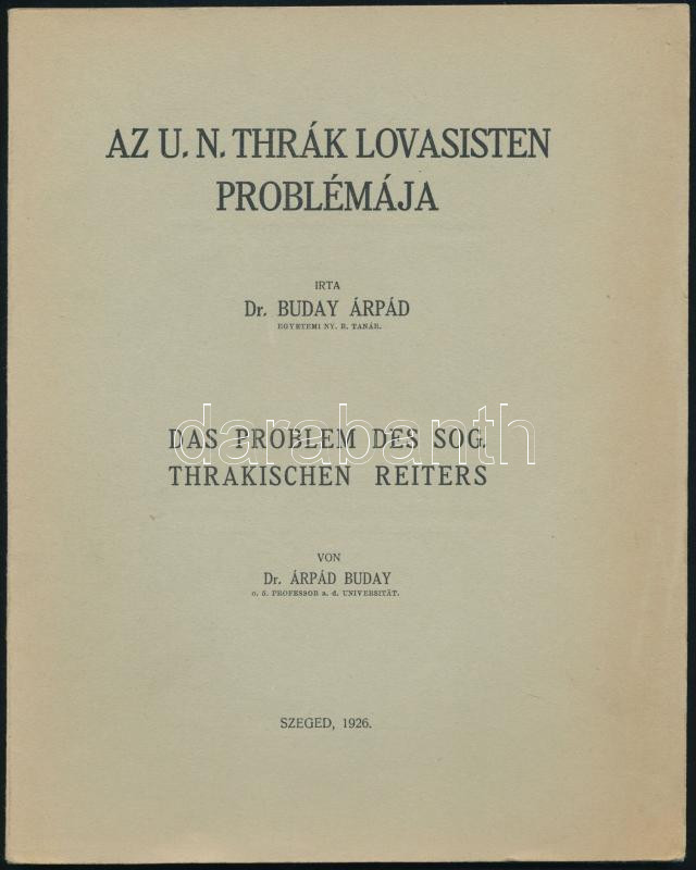 Buday Árpád: Az u. n. thrák lovasisten problémája. / Das Problem des sog. Thrakischen Reiters. Különlenyomat a Dolgozatok a Ferencz József-Tudományegyetem Archeologiai intézetéből c. folyóirat II. (1926.) évfolyamából. Szeged, 1926, (Városi-ny.), 71+(1) p. Magyar és német nyelven. Kiadói papírkötés, részben felvágatlan lapokkal. (Ritka!)