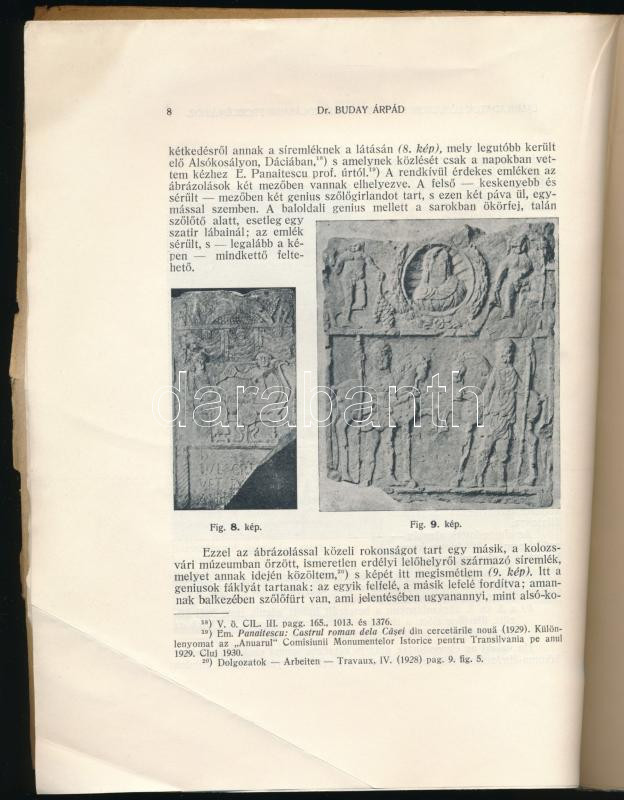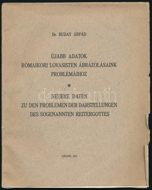 Buday Árpád: Újabb adatok rómaikori lovasisten ábrázolásaink problémáihoz. / Neuere Daten zu den Problemen der Darstellungen des sogenannten Reitergottes. Különlenyomat a Dolgozatok a m. kir. Ferencz József-tudományegyetem archeologiai intézetéből c. folyóirat 1930 (VI.) évfolyamából. Szeged, 1931, (Városi-ny.), 48 p. Magyar és német nyelven. Kiadói papírkötés, kissé sérült borítóval, felvágatlan lapokkal. (Ritka!)
