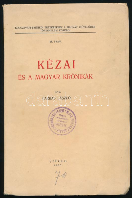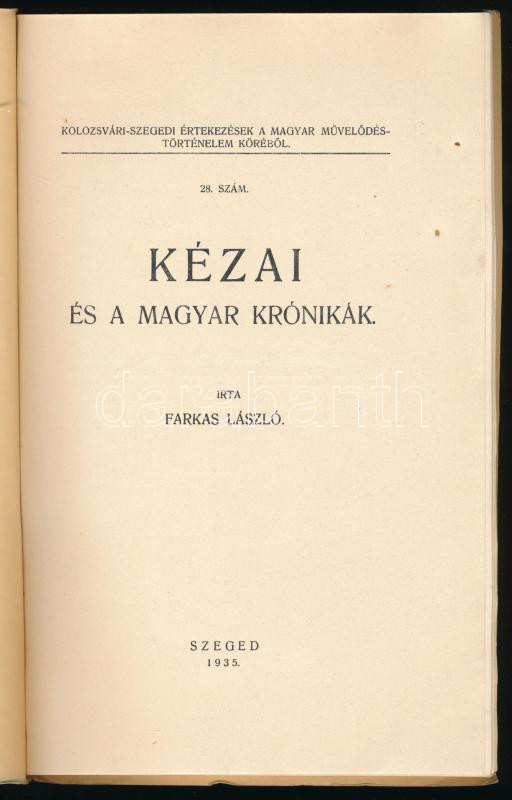 Farkas László: Kézai és a magyar krónikák. Kolozsvári-szegedi értekezések a magyar művelődéstörténelem köréből 28. sz. Szeged, 1935, szerzői kiadás (Árpád-ny.), 92+(4) p. Egyetlen kiadás. Kiadói papírkötés, minimálisan sérült borítóval és gerinccel, régi intézményi bélyegzővel. (Ritka!)