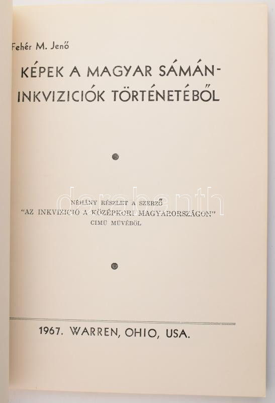Fehér M[átyás] Jenő: Képek a magyar sámán-inkvizíció történetéből. Néhány részlet a szerző "Az inkvizíció története a középkori Magyarországon" című művéből. Warren, 1967, Ohio, 67+1 p. Emigráns kiadás. Kiadói papírkötés.