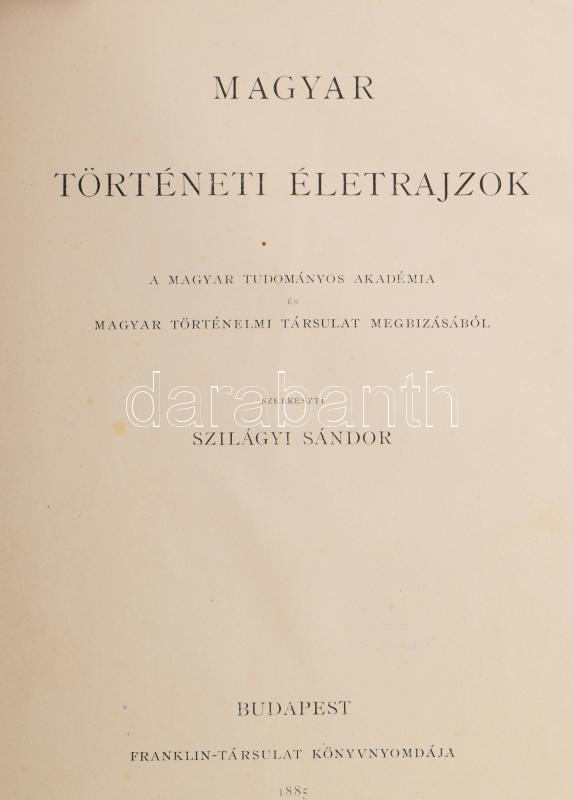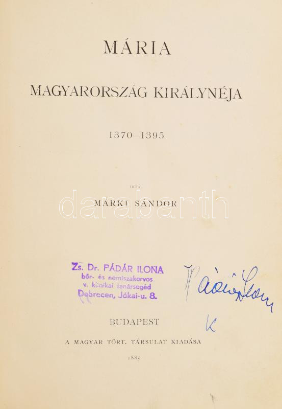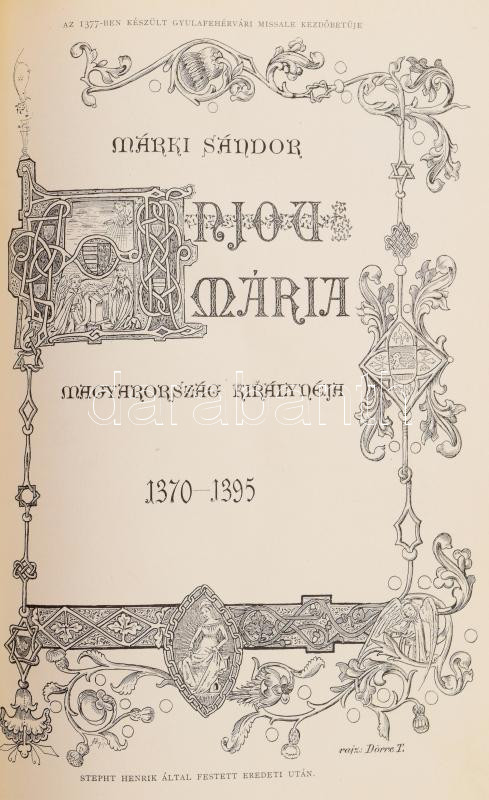 Márki Sándor: Mária Magyarország királynéja. 1370-1395. Magyar Történeti Életrajzok. Szerk.: Szilágyi Sándor. Bp., 1885, Magyar Történelmi Társulat, (Franklin-ny.),4+191 p.+7 (képtáblák, közte két szÃnes, egy szÃnes, két oldalas), 1 (szÃnes, kétoldalas térkép) t. + 2 (kihajtható melléklet) t. +Más kötetbÅ‘l származó, extra táblákkal: + 4 (16-17. között) t.+1 (97-97. között) t. Oldalszámozáson belül gazdag fekete-fehér szövegközti és egészoldalas képekkel, hasonmásokkal illusztrált. Korabeli aranyozott, álbordás vörös, gerincű félbÅ‘r-kötésben, kopott borÃtóval, az egyik kihajtható tábla szakadt, a másik sérült.