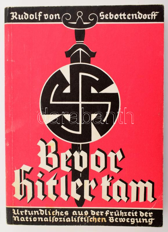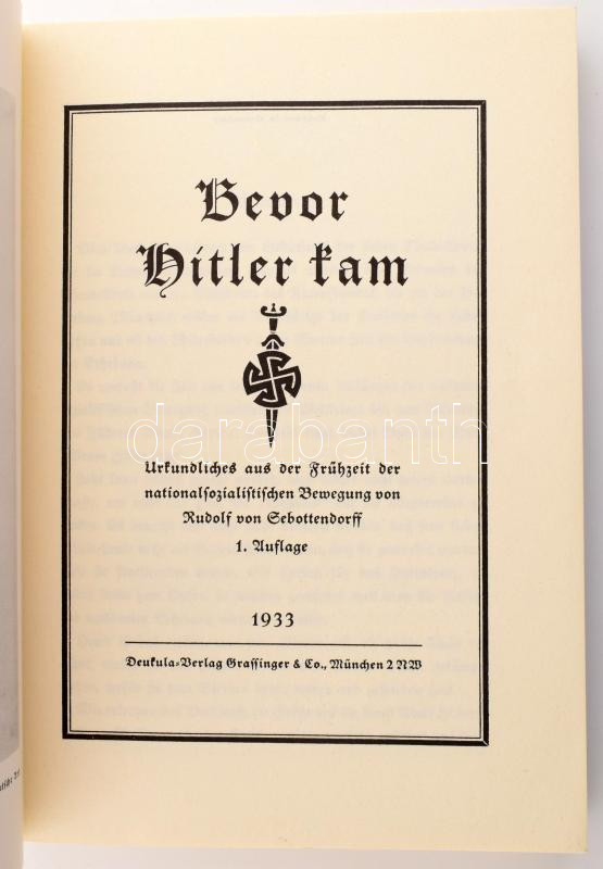 Rudolf von Sebottendorf: Bevor Hitler Kam. Urkundliches aus der Frühzeit der nationalsozialistischen Bewegung von - -. München, 1933, Deukula-Verlag Grassinger & Co., 1 t. + 267 p. Német nyelven. Fekete-fehér fotókkal illusztrált. Kiadói papírkötés, kissé kopott borítóval.