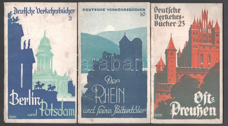 3 db német útikönyv: Berlin und Potsdam.; Der Rhein und seine Seitentäler.; Ostpreußen. Deutsche Verkehrsbücher 3., 10., 23. Berlin, é.n. (cca 1930-1940), Reichsbahnzentrale für den Deutschen Reiseverkehr. Fekete-fehér képekkel, térképekkel. Német nyelven. Kiadói papírkötés, változó állapotban.