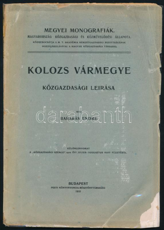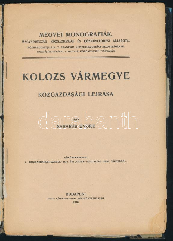 Barabás Endre: Kolozs vármegye közgazdasági leírása. Különlenyomat a 'Közgazdasági Szemle' 1910. évi julius-agusztus havi füzetéből. Budapest, 1910, Pesti-Könyvnyomda-Részvénytársaság. 58 p. Kiadói papírkötés kis sérüléssel