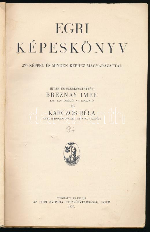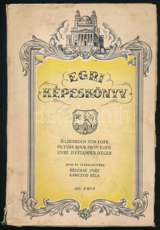 Breznay Imre - Karczos Béla: Egri képeskönyv. 250 képpel és minden képhez magyarázattal. Eger, 1937, Egri Nyomda Rt., 126+(2) p. Egyetlen kiadás. Gazdag fekete-fehér képanyaggal illusztrálva. Kiadói papírkötés, kissé koszos, sérült borítóval és gerinccel, néhány lapon apró sérülésekkel.