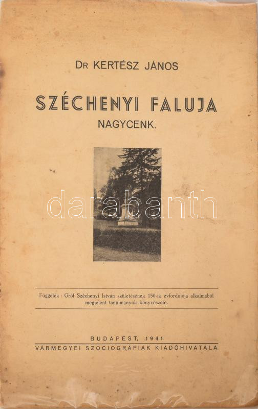 Kertész János: Széchenyi faluja Nagycenk. Függelék: Gróf Széchenyi István születésének 150-ik évfordulója alkalmából megjelent tanulmányok könyvészete. A szerző, Kertész János által DEDIKÁLT példány! Bp., 1941, Vármegyei Szociográfiák Hivatal, (Dombóvár, Bagó Mihály-ny.), 24 p. Kiadói papírkötés, foltos borítóval.