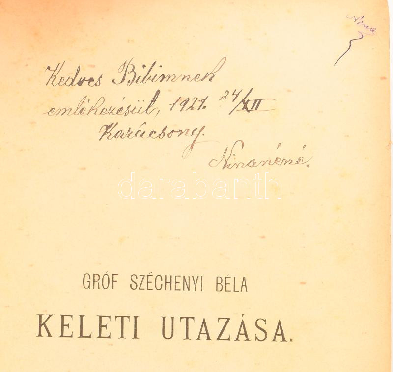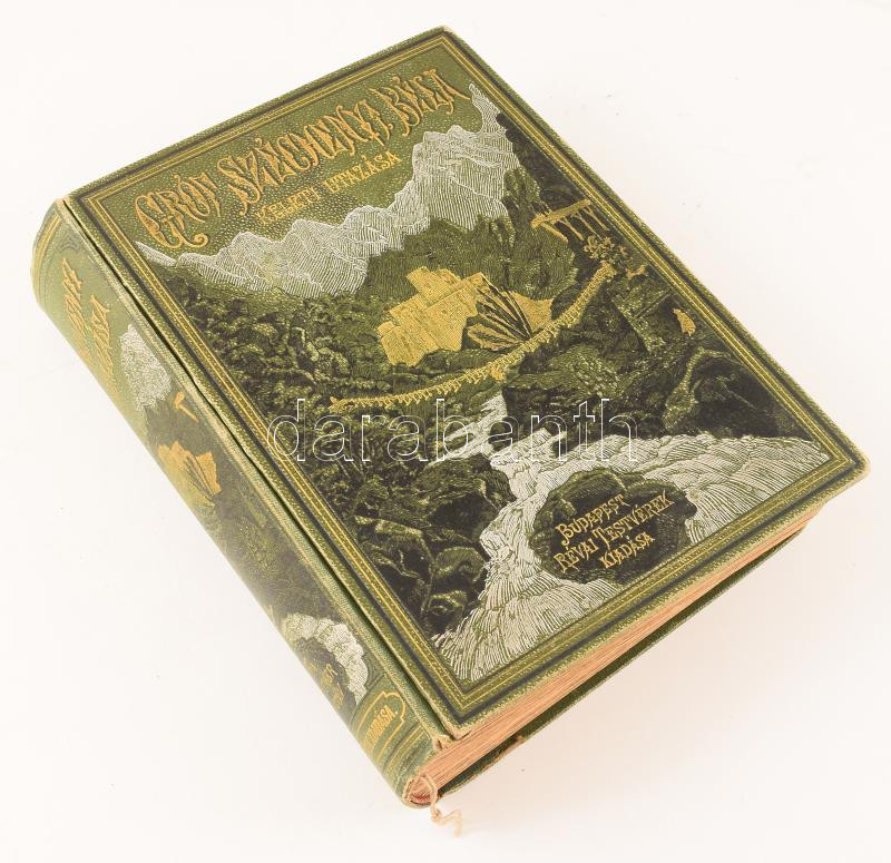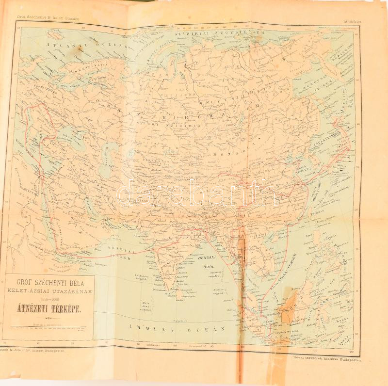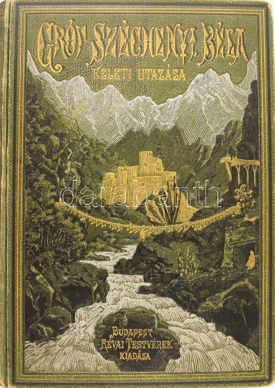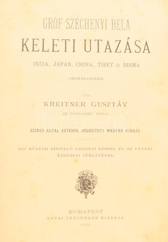 Kreitner Gusztáv: Gróf Széchényi Béla keleti utazása India, Japan, China, Tibet, és Birma országokban. Bp.,1882, Révai, XVI+1028 p. + 1 (Gróf Széchényi Béla Kelet-Ázsiai utazásának (1878-1880) átnézeti térképe, a hátoldala javított, 38x39 cm ) t. Számos szövegközti és egészoldalas fekete-fehér illusztrációval. Kiadói aranyozott, festett, illusztrált egészvászon-kötés,(Scheibe Ármin-kötés, Bécs,) festett lapélekkel, kopott borítóval, javított kötéssel, a térkép hátoldala javított, ajándékozási sorokkal, laza elülső előzéklappal.