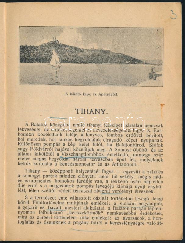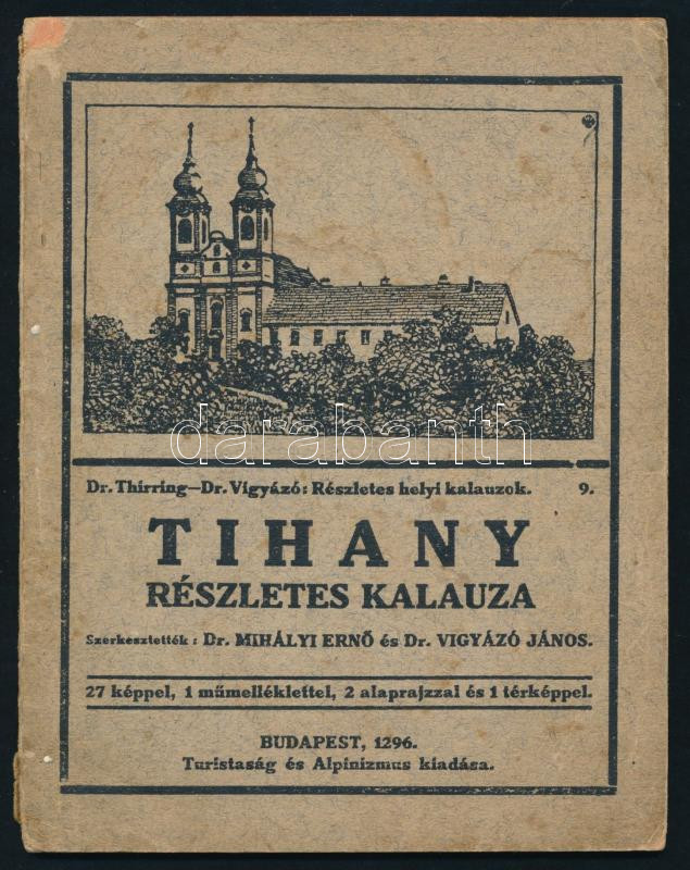Leírás: Mihályi Ernő -Vigyázó János (szerk.): Tihany részletes kalauza. Dr. Thirring - Dr. Vigyázó: Részletes helyi kalauzok 9. Bp., 1926, Turistaság és Alpinizmus, 1 (címkép) t.+ 47+(1) p.+ 1 (kihajtható térkép) t. Kiadói papírkötés, kissé sérült, foltos borítóval, helyenként kissé sérült lapokkal, bejegyzésekkel.