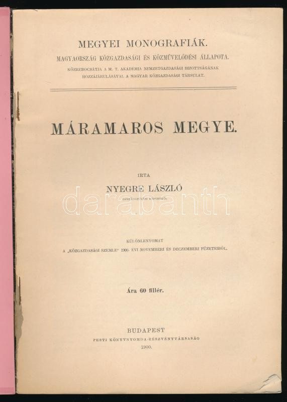 Bp. 1900. Pesti Könyvnyomda. 50 l. (Megyei Monográfiák. Magyarország Közgazdasági és közművelődési állapota. ) pótolt papírborítóban.