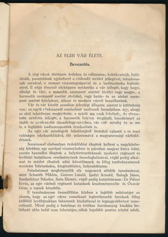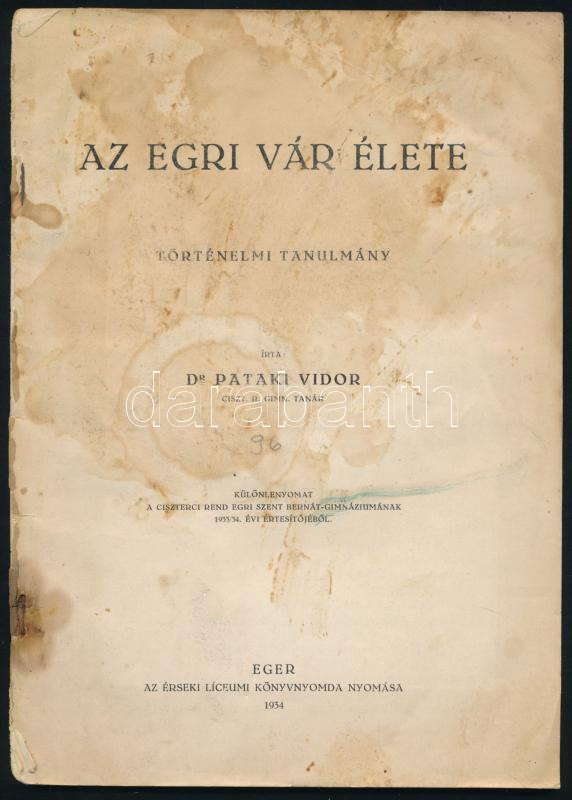 Pataki Vidor: Az egri vár élete. Történelmi tanulmány. (Különlenyomat a ciszterci rend egri Szent Bernát-gimnáziumának 1933/34. évi értesítőjéből.) Eger, 1934, szerzői kiadás (Érseki Líceumi-ny.), 47+(1) p.+ 10 (térképek) t. Kiadói tűzött papírkötés, viseltes állapotban, foltos.
