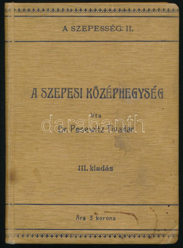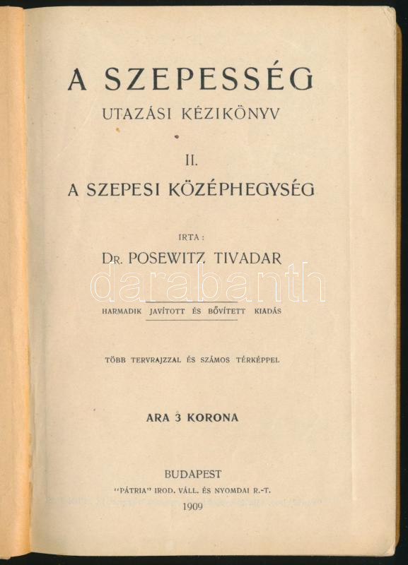 Posewitz Tivadar: A Szepesi középhegység. A Szepesség. Utazási kézikönyv. II. köt. Bp., 1909,"Pátria",176+2 p.+12 t. Harmadik, javított és bővített kiadás. Gazdag képanyaggal, fekete-fehér képekkel, alaprajzokkal, térképvázlatokkal illusztrált. Kiadói egészvászon-kötés,
