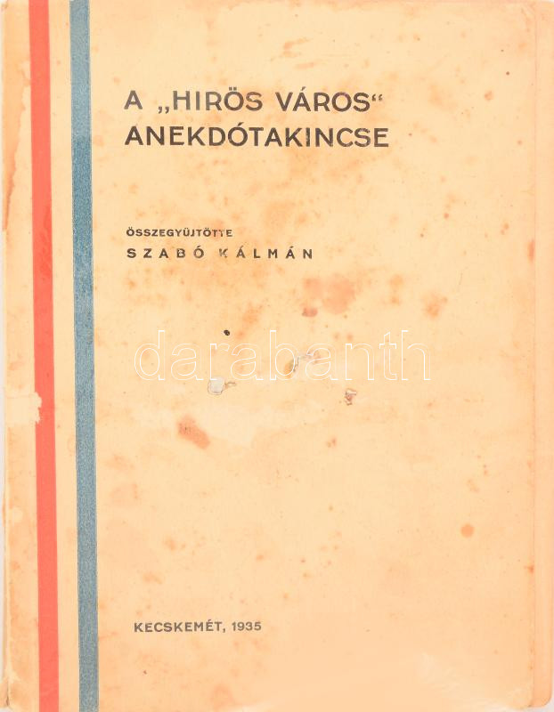Szabó Kálmán: A "hírös város" anekdótakincse. Összeáll.: - -. Kecskemét, 1935., Első Kecskeméti Hírlapkiadó, 139 p. Kiadói papírkötés, kopott, foltos borítóval, javított gerinccel, kissé sérült kötéssel és néhány kijáró lappal (3-14 p.)