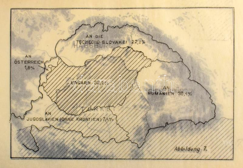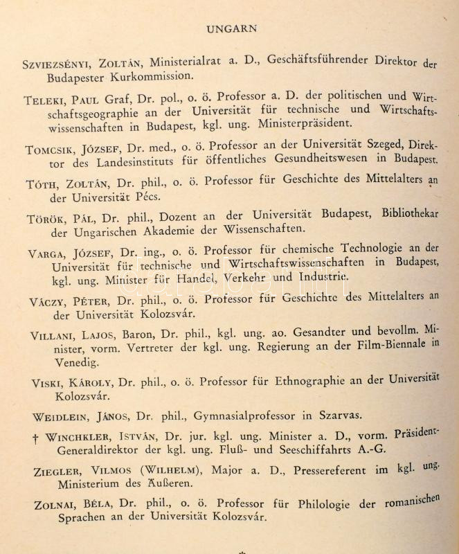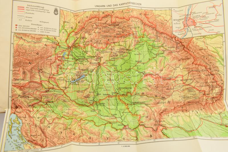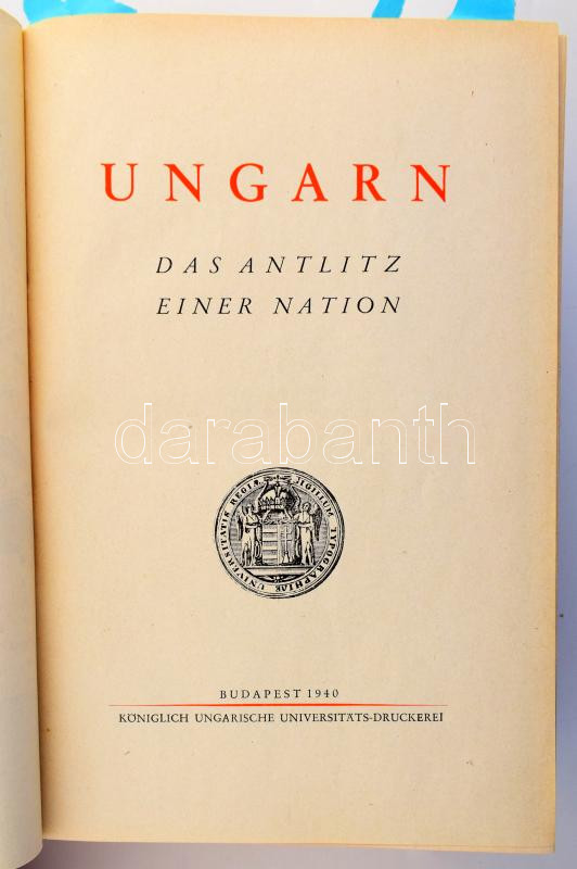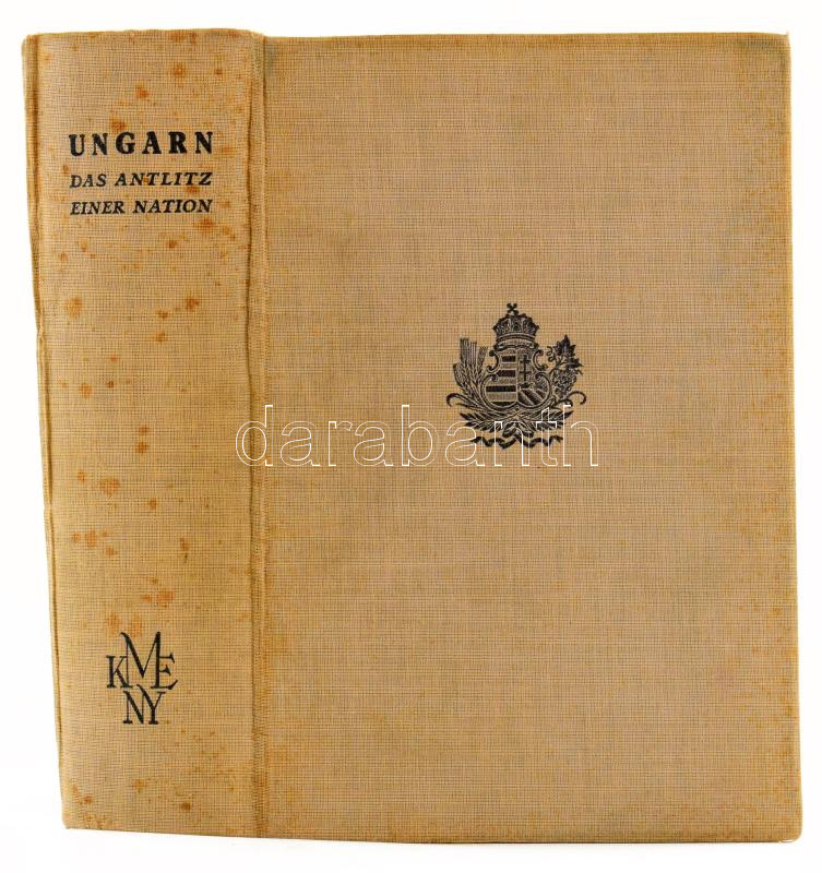 Ungarn. Das Antlitz einer Nation. Hrsg. von Zoltán Baranyai. Bp., 1940., Königlich Ungarische Universitäts-Druckerei,VIII+869 p.+74 t.+3 (térképek) t. + 1 (nagyméretű, kihajtható térkép-melléklet a kötet végén) t. Nagyon gazdag fekete-fehér szövegközti képanyaggal, köztük fotók, térképek, ábrák...stb. A kötéstáblák belső részén térképpel. Kiadói egészvászon-kötés, kissé kopott, foltos borítóval, laza fűzéssel.