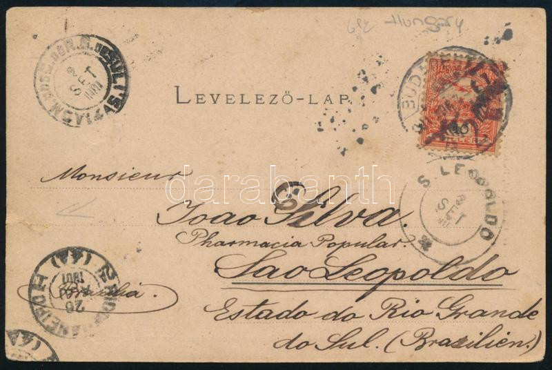 Leírás: 1901 Képeslap Turul 10f bérmentesítéssel Brazíliába küldve, "RIO DE JANEIRO" átmenő és "S. LEOPOLDO" érkezési bélyegzéssel, "BUDAPEST / 2" / Postcard shipped to Brazil