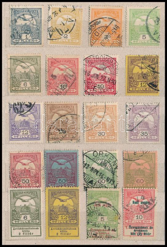 Leírás: 1913-1914 20 db Turul és Árvíz bélyeg bélyeg azonos "nyitott rács" lemezhibával