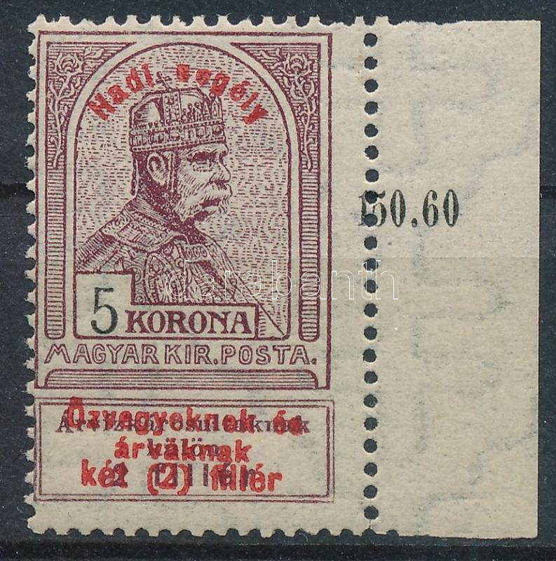 Leírás: 1914 Hadisegély I. 5K ívszéli bélyeg, az ívszéli összegzési szám részben a bélyeghez fogazva (9.000+++)