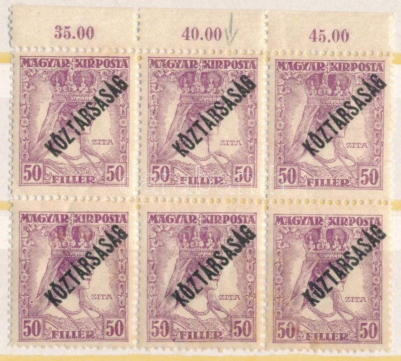 Leírás: 1918 Zita / Köztársaság 50f, ívszéli hatostömb, benne szakadt fátyol lemezhiba (gumiráncok)