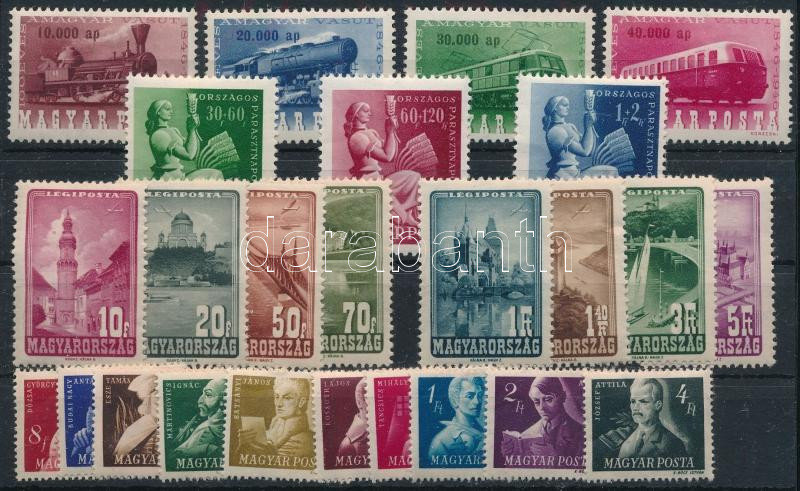 Leírás: 1946-1947 Vasútjubileum, Parasztnapok, Repülő (IV.) és Szabadsághőseink 1-1 sor (**12.500)
