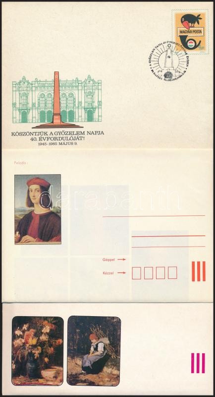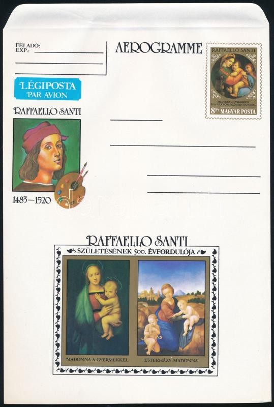 1983 Raffaaello díjjegyes aerogramm + 3 db illusztrált boríték https://www.darabanth.com/hu/500-Gyorsarveres/500.0/Magyar-filatelia-es-postatortenet/1980-1989-kozotti-kiadasok~62/1983-Raffaaello-dijjegyes-aerogramm-plus-3-db-illusztralt-boritek~II1836678