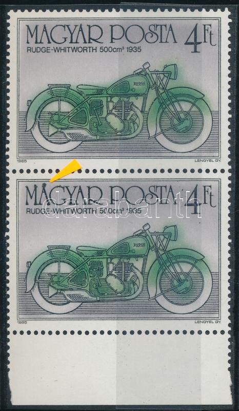 Leírás: 1985 100 éves a motorkerékpár 4Ft függőleges pár, az alsó bélyegen megfolyt betűk