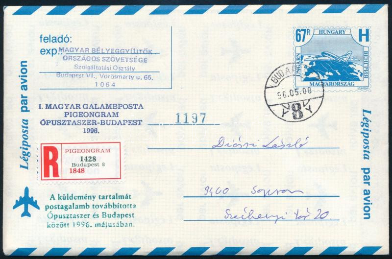 Leírás: 1996 I. Magyar Galambposta Pigeongram számozott (1197) példány, a MABÉOSZ által feladott eredeti borítékban
