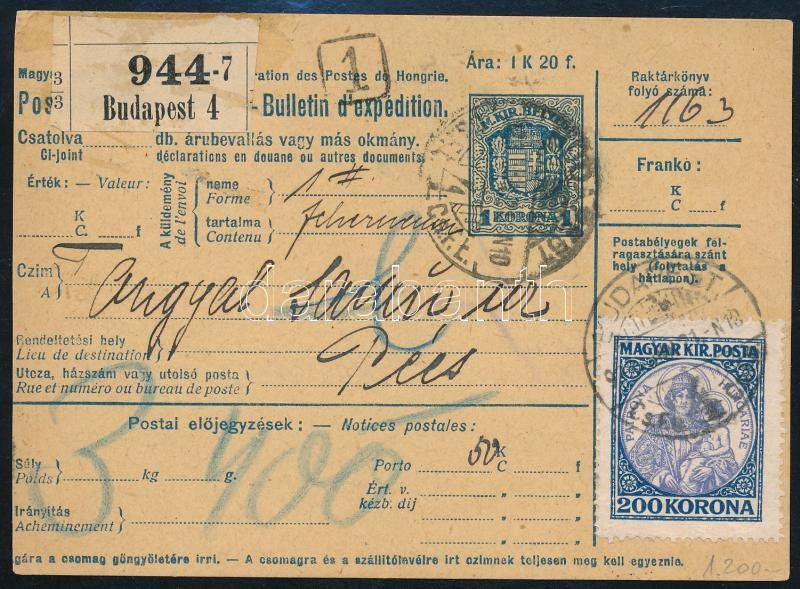 Leírás: 1923 Csomagszállító 200K Koronás Madonnával és 2 db Hivatalos bélyeggel