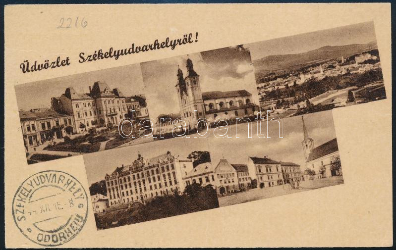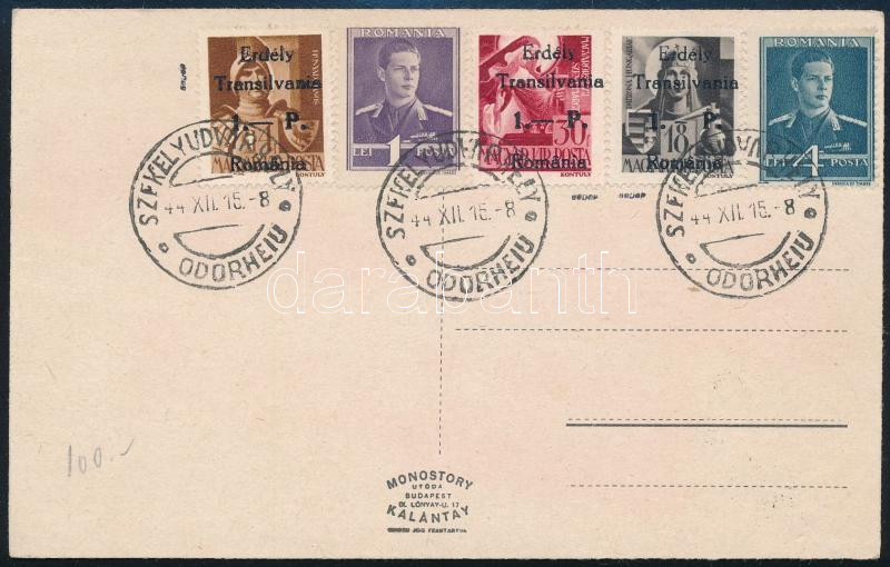 Leírás: Székelyudvarhely 1944 Képeslap 3 klf felülnyomott magyar kiadással + 2 db román bélyeggel "SZÉKELYUDVARHELY / ODORHEIU", Bodor vizsgálójellel