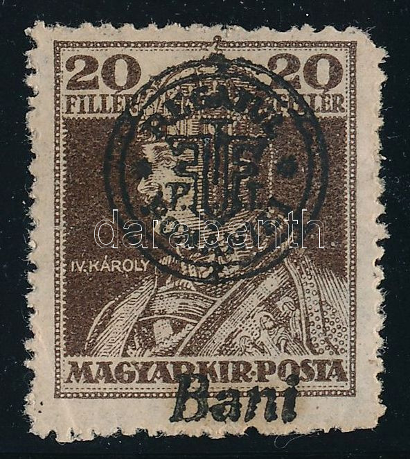 Leírás: Nagyvárad 1919 Károly 20f elcsúszott felülnyomattal, a Bani szó alulra került, Bodor vizsgálójellel
