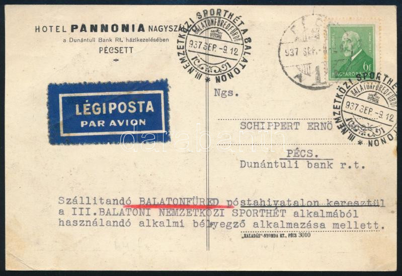 Leírás: 1937 Légi levelezőlap "III. NEMZETKÖZI SPORTHÉT A BALATONON"