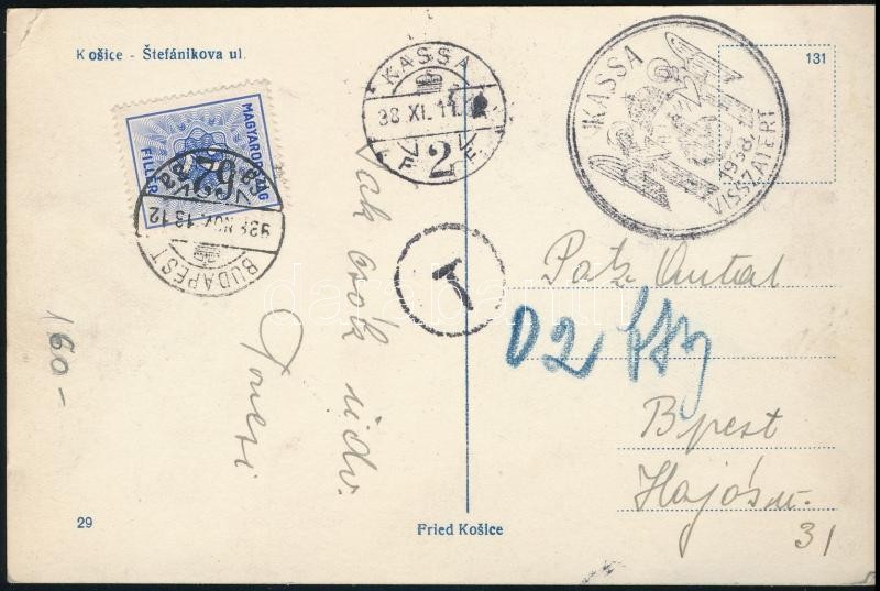 Leírás: 1938 Képeslap 2f portóval és KASSA VISSZATÉRT bélyegzéssel
